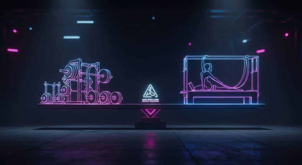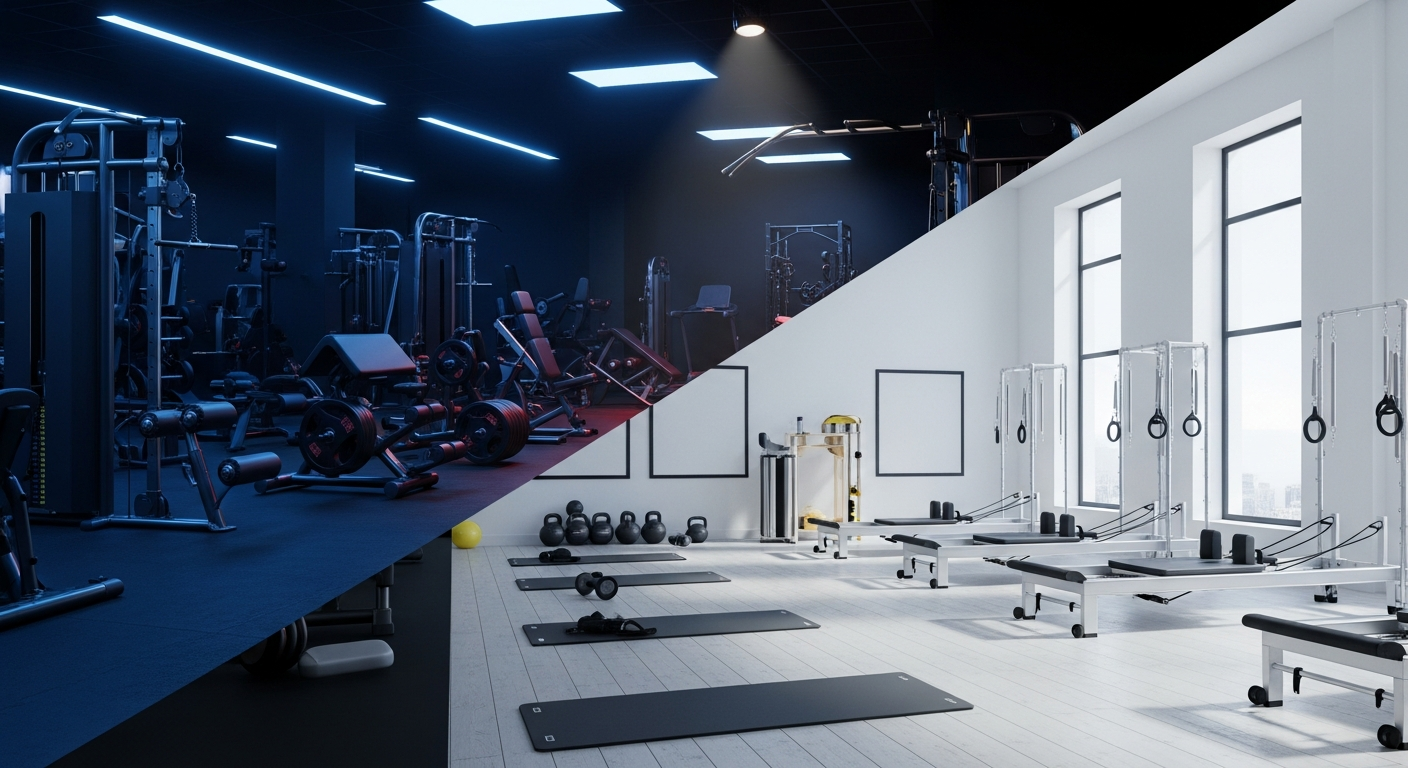 従来のジムは筋肥大に特化していますが、柔軟性や体幹を鍛えるプログラムは限られています。一方、ピラティス専門スタジオは体幹や姿勢改善に優れていますが、大きな筋肉を効率的に鍛えるには不向きです。