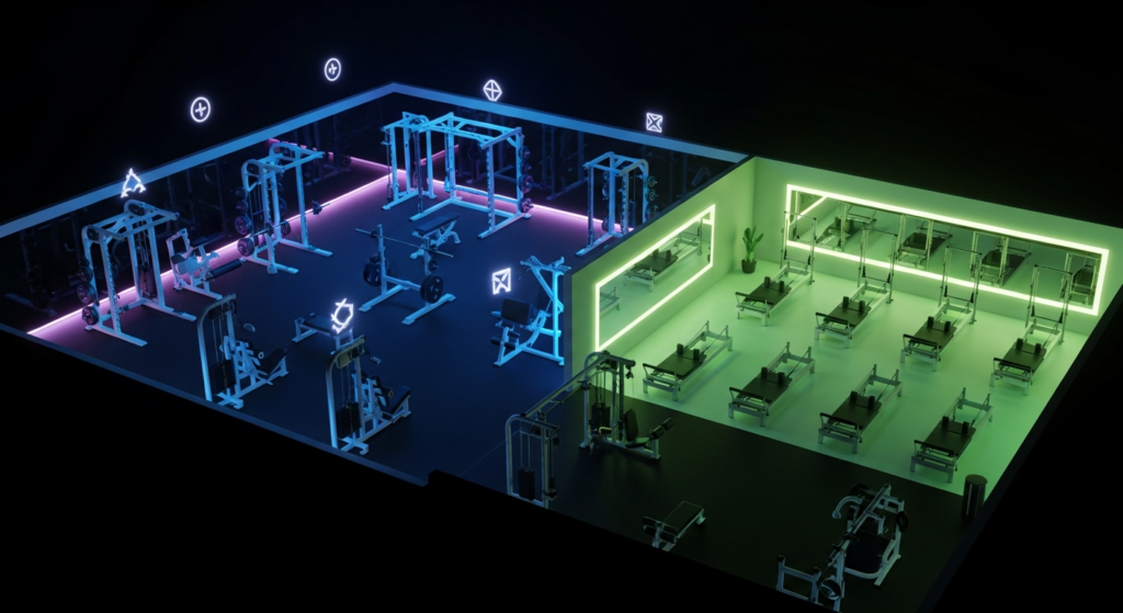 ジムとピラティスを併設したスタジオは、筋トレマシンやフリーウェイトエリアとリフォーマー(ピラティス専用マシン)が同じ施設内にある形態です。従来は別々の施設に通う必要があった2つのトレーニングを、1つの場所で完結できます。