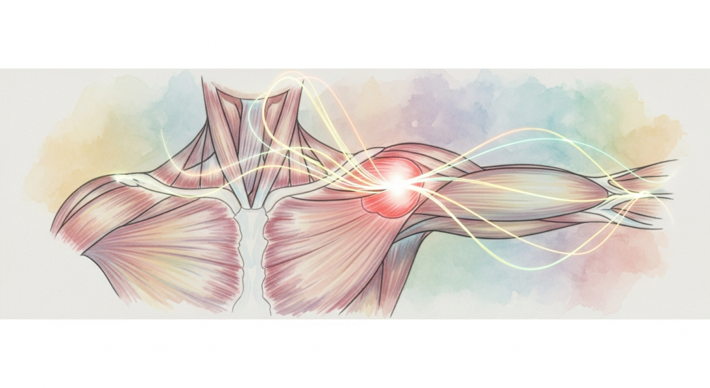 その結果、肩関節への不自然な負担が軽減されます。これが痛みの緩和につながる根本的な理由です。