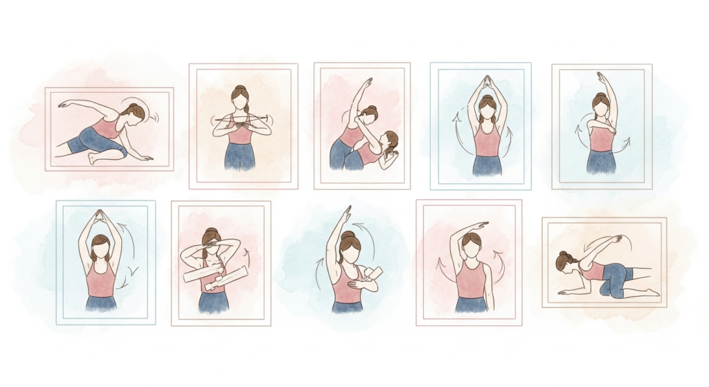 まずは、硬くなった肩甲骨周りの柔軟性を高めるエクササイズから始めましょう。これらの動きは比較的穏やかで、五十肩の方でも取り組みやすいものばかりです。