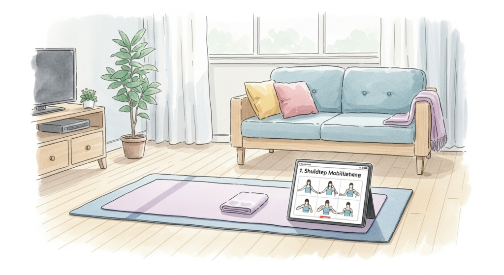 - 低負荷で肩に優しい: 痛みを悪化させにくいエクササイズが中心